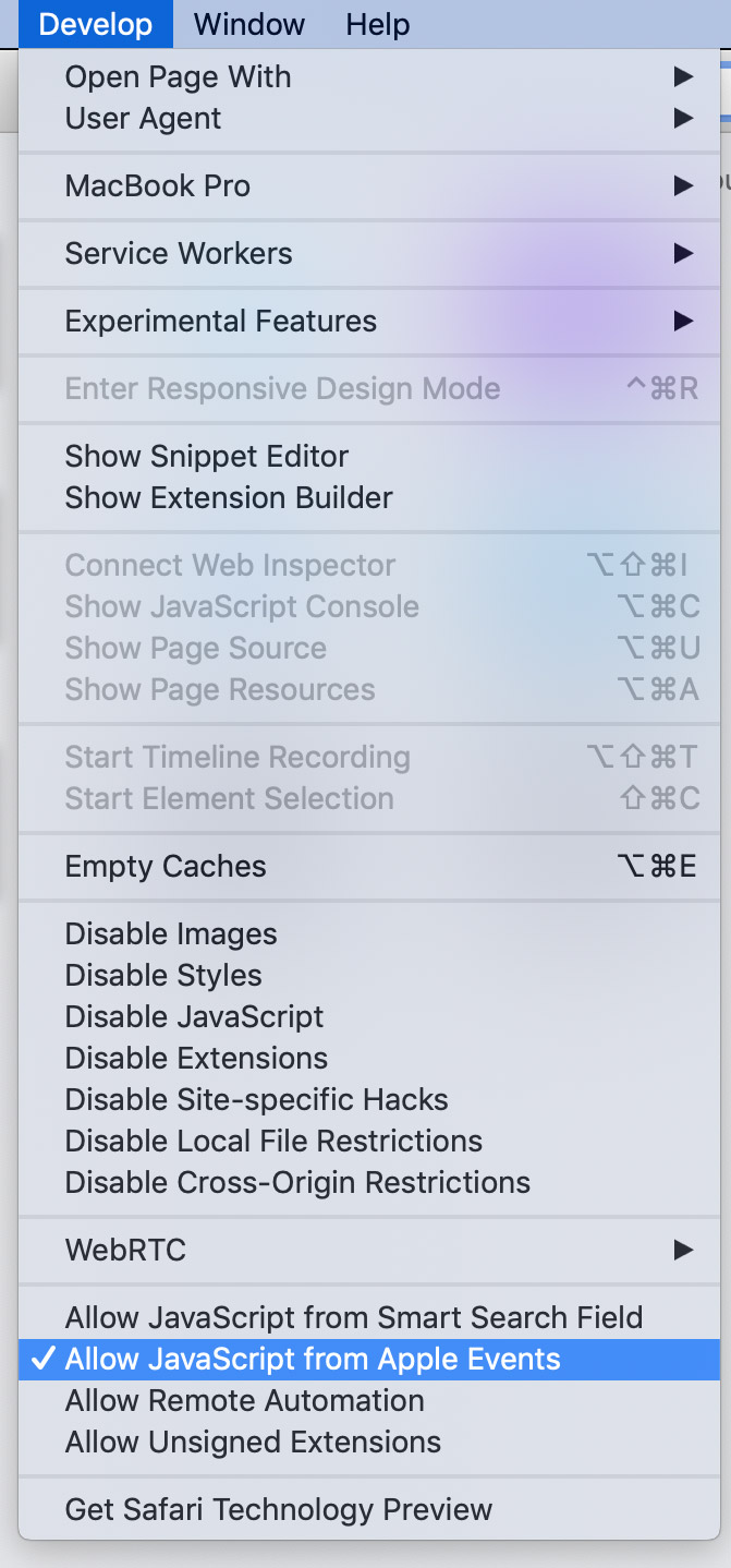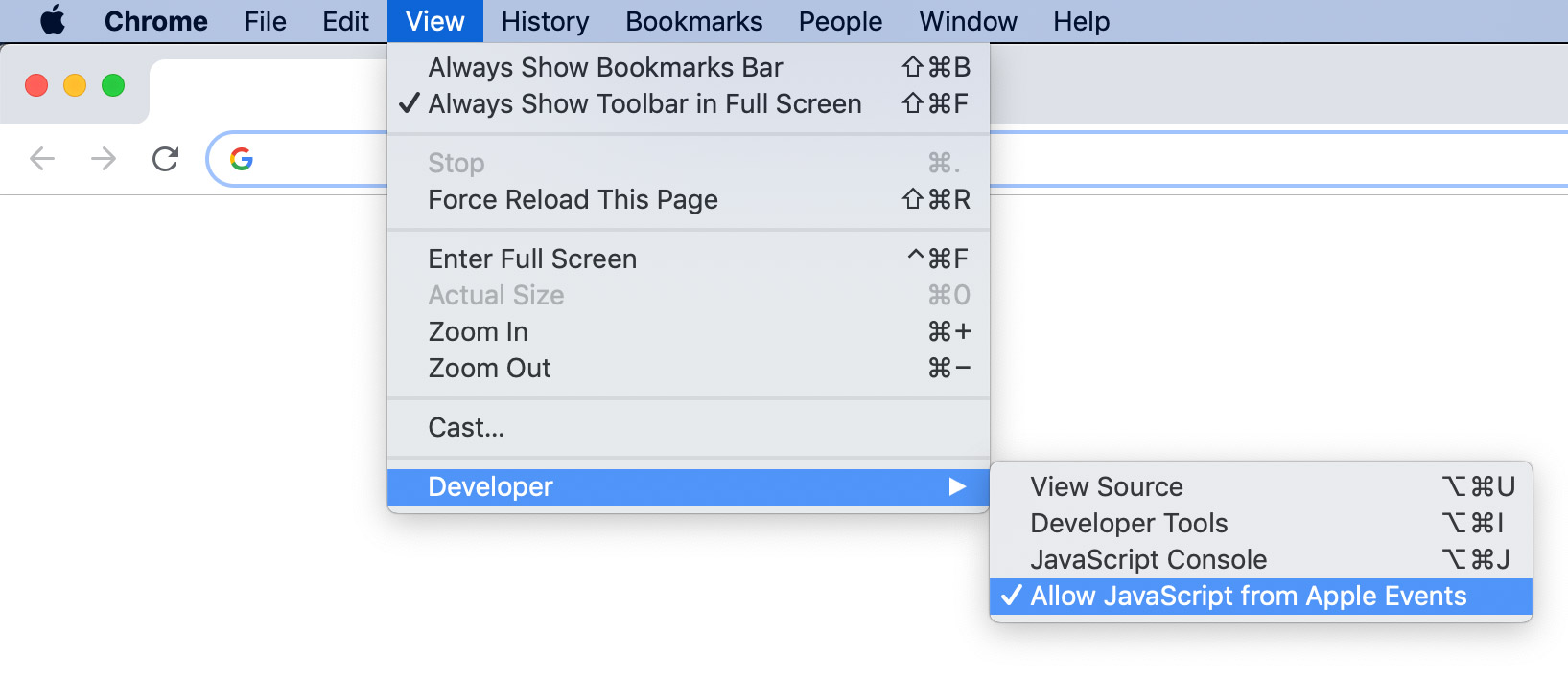 - In topbar menu View > Developer > Check Allow JavaScript from Apple Events