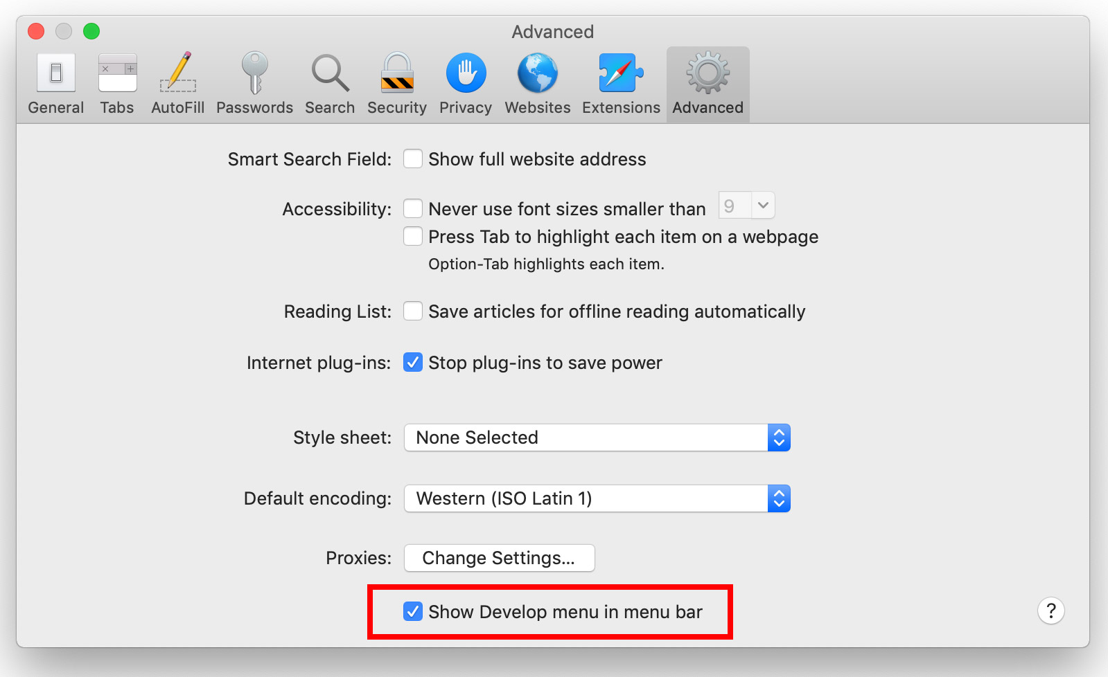 - In Safari Preferences > Advanced > Check Show Develop menu in menu bar